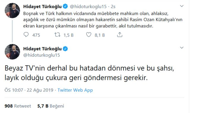 Türkoğlu sosyal medya hesabından "Boşnak ve Türk halkının vicdanında müebbete mahkum olan, ahlaksız, aşağılık ve özrü mümkün olmayan hakaretin sahibi Rasim Ozan Kütahyalı'nın ekran karşısına çıkarılması nasıl bir garabettir, akıl tutulmasıdır. Beyaz TV'nin derhal bu hatadan dönmesi ve bu şahsı, layık olduğu çukura geri göndermesi gerekir." ifadelerini kullandı.