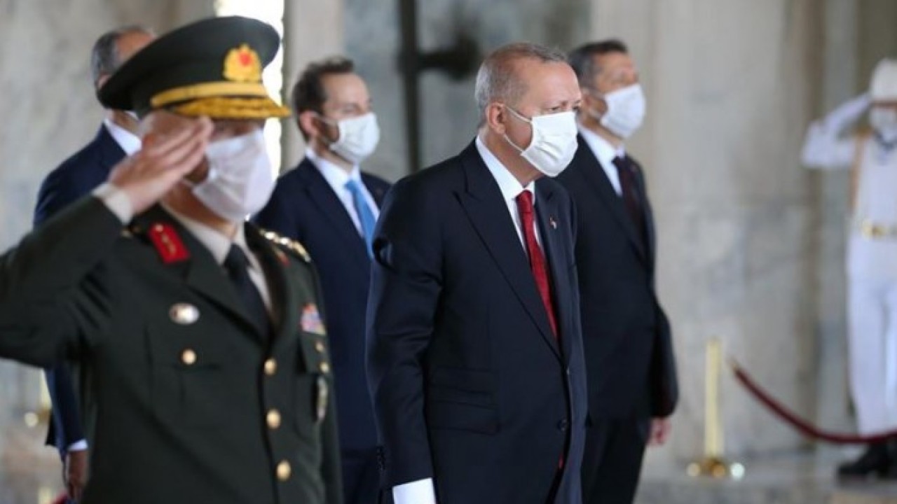 Cumhurbaşkanı Erdoğan'ın, ay yıldız motifli çelengi Türkiye Cumhuriyeti'nin kurucusu Gazi Mustafa Kemal Atatürk'ün mozolesine bırakmasının ardından, saygı duruşunda bulunuldu ve İstiklal Marşı okundu.