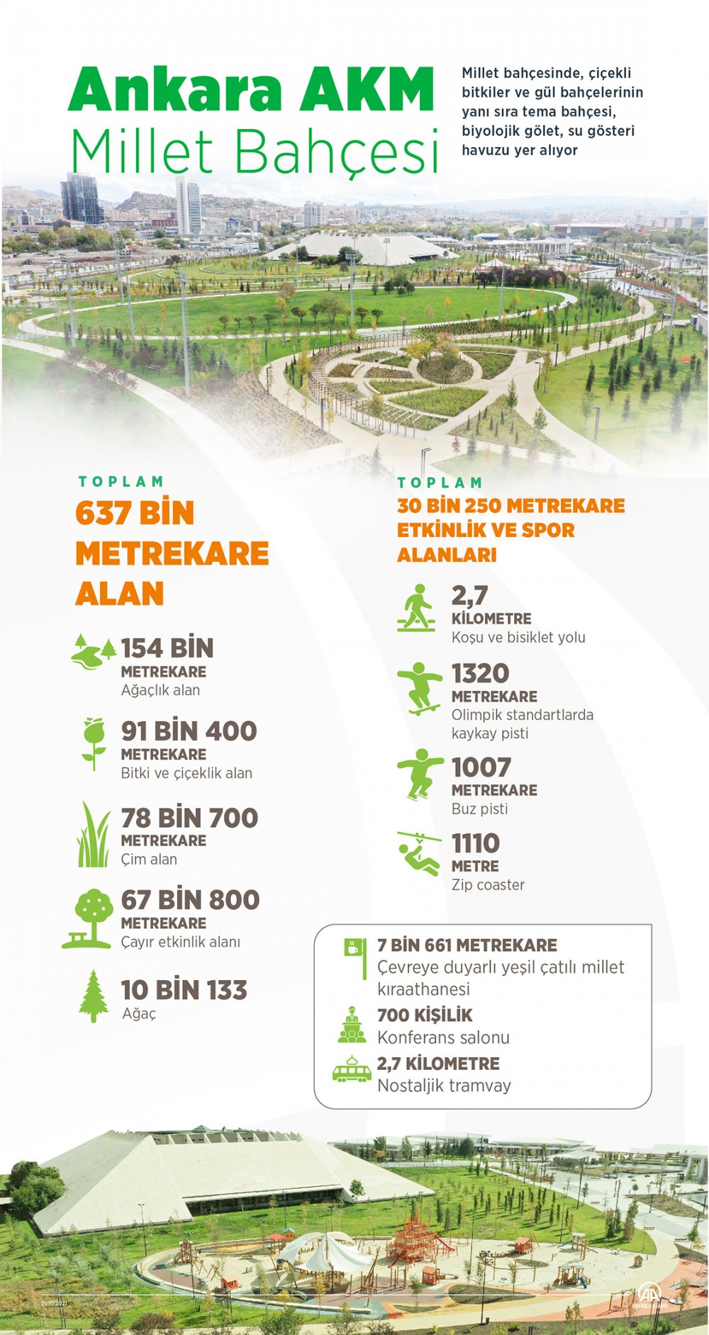- Dev bir projenin en önemli kısımlarından birini oluşturan Başkent Millet Bahçesi 700 bin metrekarelik bir alanda kuruldu. Başkent Millet Bahçemiz her yaştan insanımıza hitap eden imkanlara sahiptir. Millet Bahçemizde içinde binlerce kitabı olan bir Millet Kıraathanemiz olacak. Tohum merkezi, binicilik ve etkinlik çayırları, spor sahaları, açık hava sineması, su gösteri havuzu gibi bölümler de Millet Bahçemizin içinde yer alıyor. İçinde 5 bin kişilik konferans salonu da bulunuyor. Cami, sanat atölyeleri, sağlık merkezi gibi alanlarla bir eser kazandırdık. Millet Bahçemiz rengarenk çiçeklerin, çeşit çeşit meyve ve sebzelerin yetiştirileceği bir bostana da sahiptir.