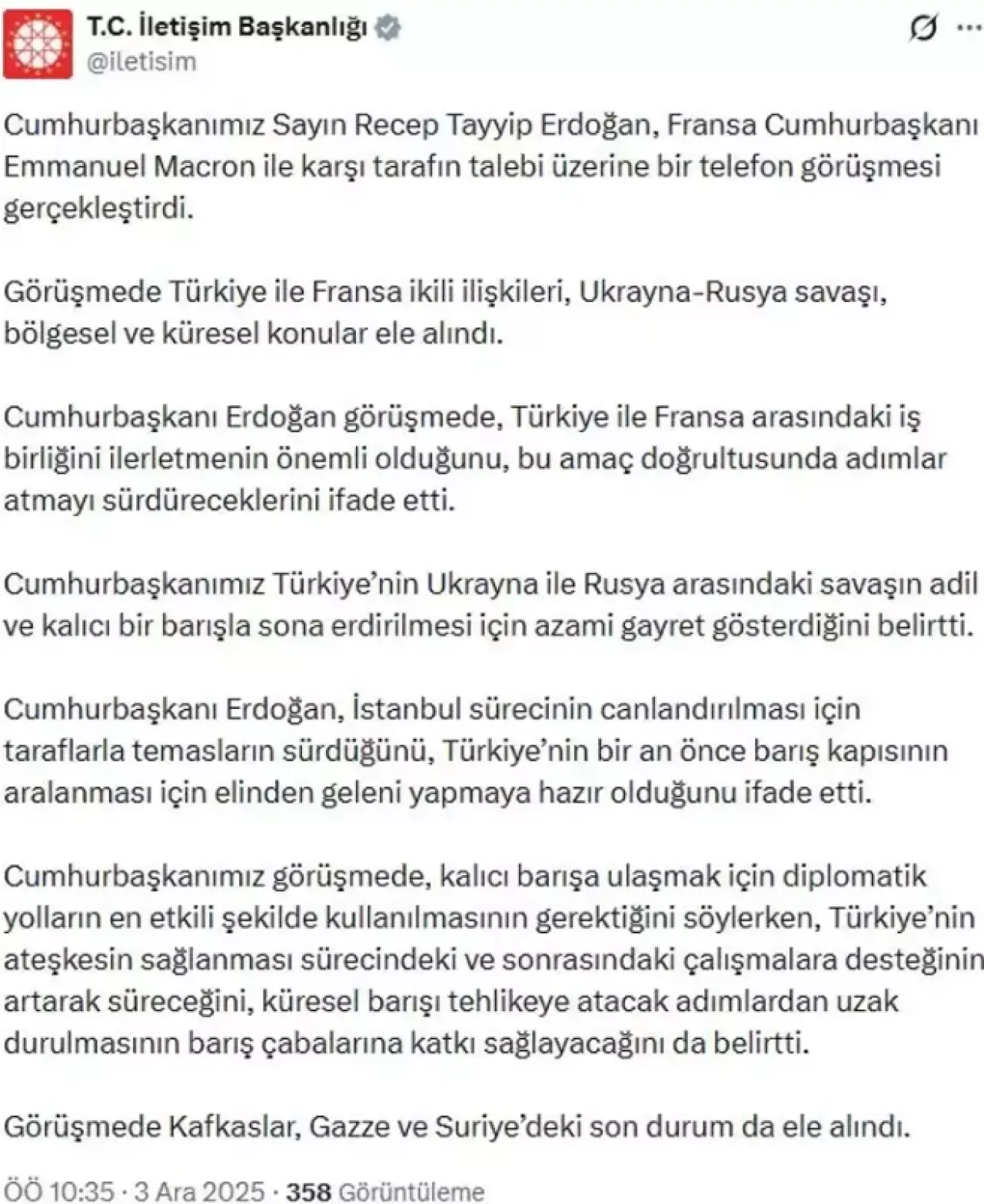 Cumhurbaşkanı Erdoğan görüşmede, Türkiye ile Fransa arasındaki iş birliğini ilerletmenin önemli olduğunu, bu amaç doğrultusunda adımlar atmayı sürdüreceklerini söyledi.