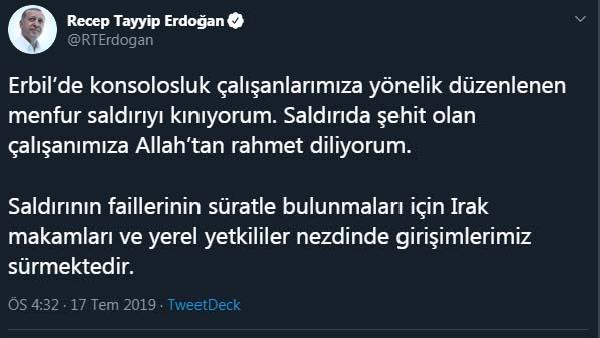 Cumhurbaşkanı Recep tayyip Erdoğan, Erbil Başkonsolosluğu görevlisinin silahlı saldırıda şehit edilmesiyle ilgili, Twitter hesabından açıklama yaptı. Erdoğan, "Erbil'de konsolosluk çalışanlarımıza yönelik düzenlenen menfur saldırıyı kınıyorum. Saldırıda şehit olan çalışanımıza Allah'tan rahmet diliyorum. Saldırının faillerinin süratle bulunmaları için Irak makamları ve yerel yetkililer nezdinde girişimlerimiz sürmektedir" ifadelerini kullandı.