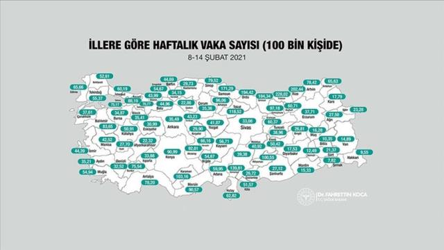 Yüz binde 100'ün üstünde vaka seyri görülen iller: Adıyaman, Tokat, Karaman, Osmaniye, Samsun, Giresun, Ordu, Rize ve Trabzon.