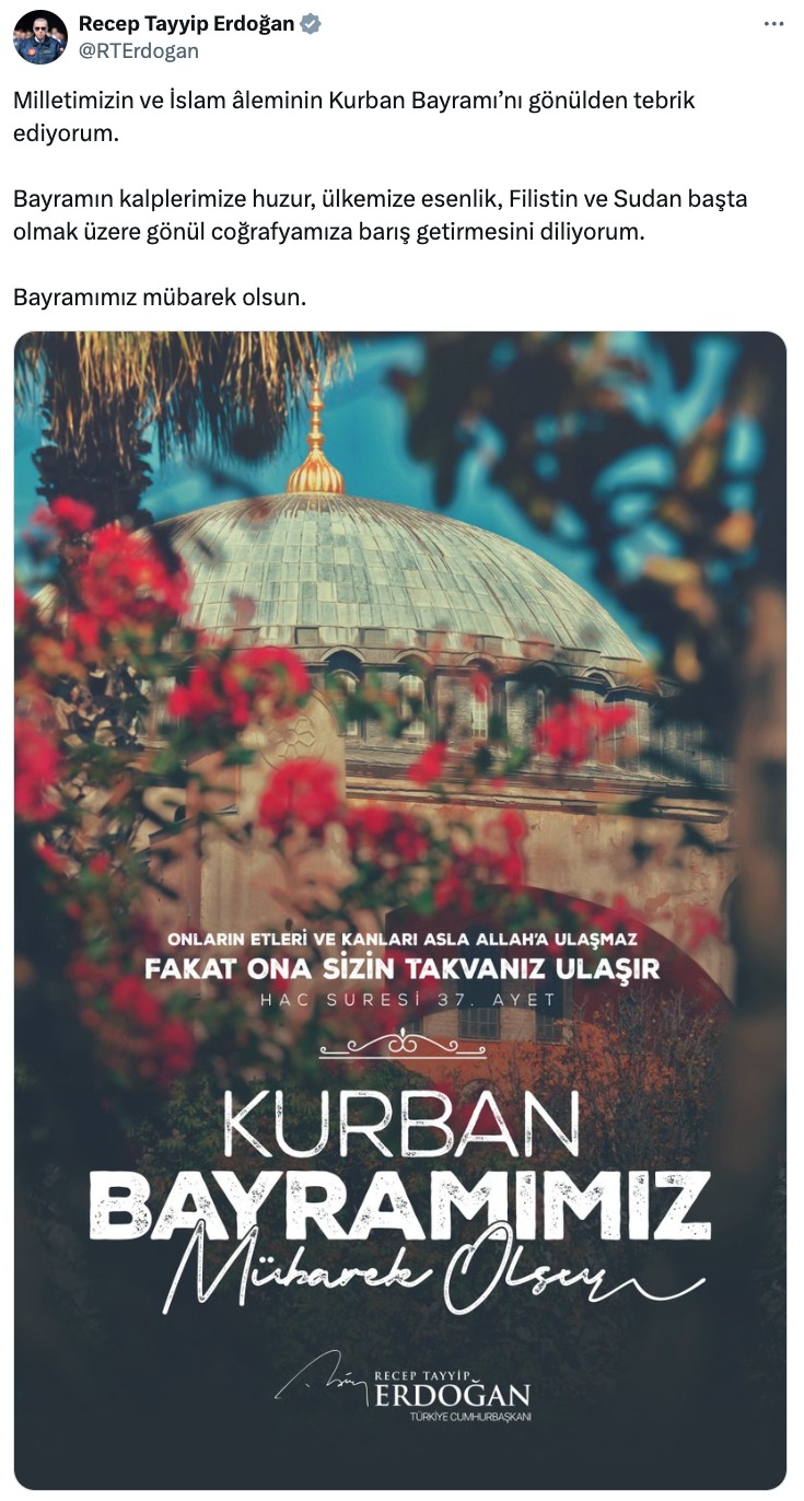 Cumhurbaşkanı Recep Tayyip Erdoğan, Kurban Bayramı dolayısıyla sosyal medya hesabından bir mesaj yayınladı.