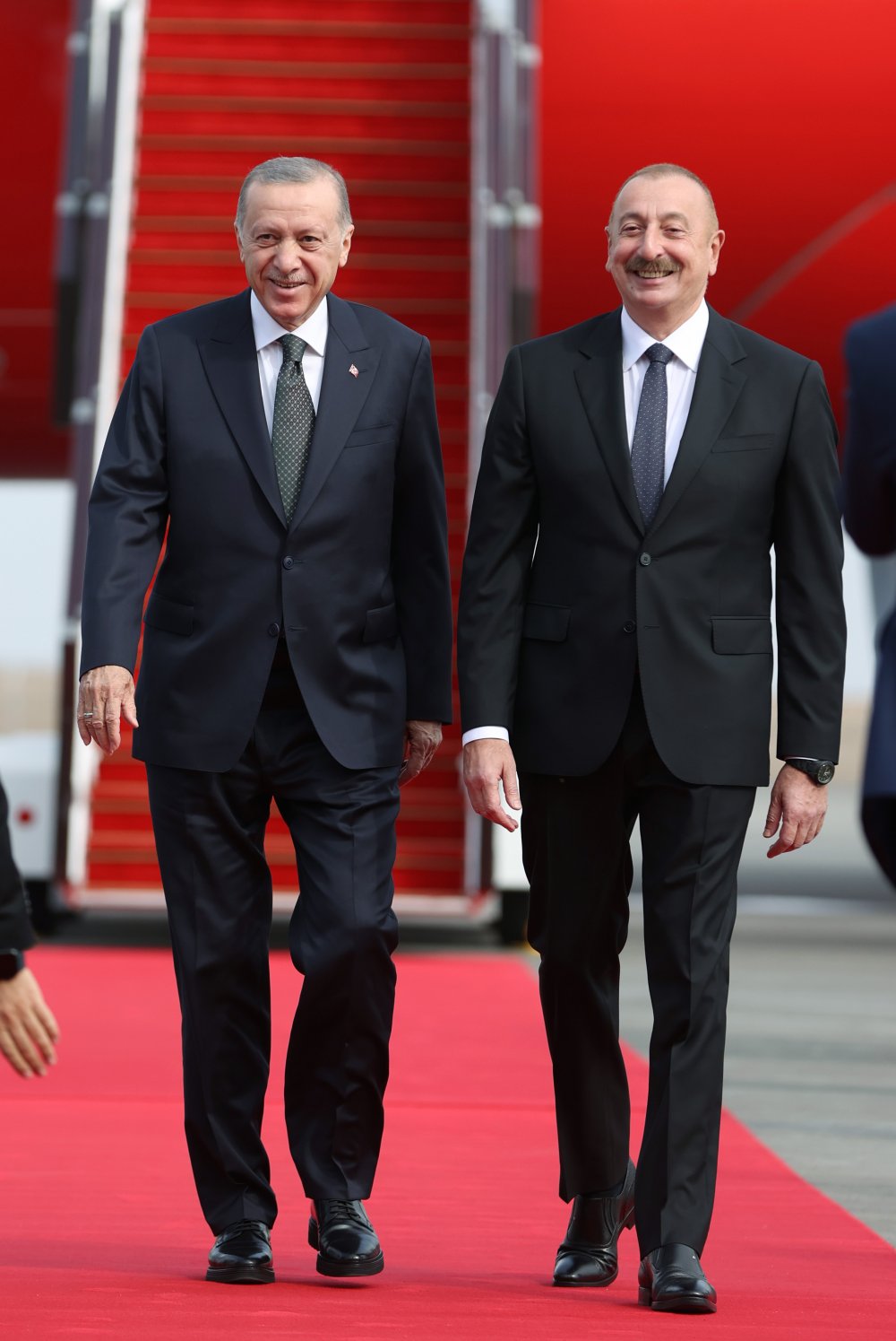 Azerbaycan Cumhurbaşkanı İlham Aliyev (sağda) tarafından karşılanan Erdoğan, yapımı tamamlanan havalimanına inen ilk devlet başkanı oldu. İki lider, açılışın ardından havalimanı binasını gezdi, yetkililerden bilgi aldı.