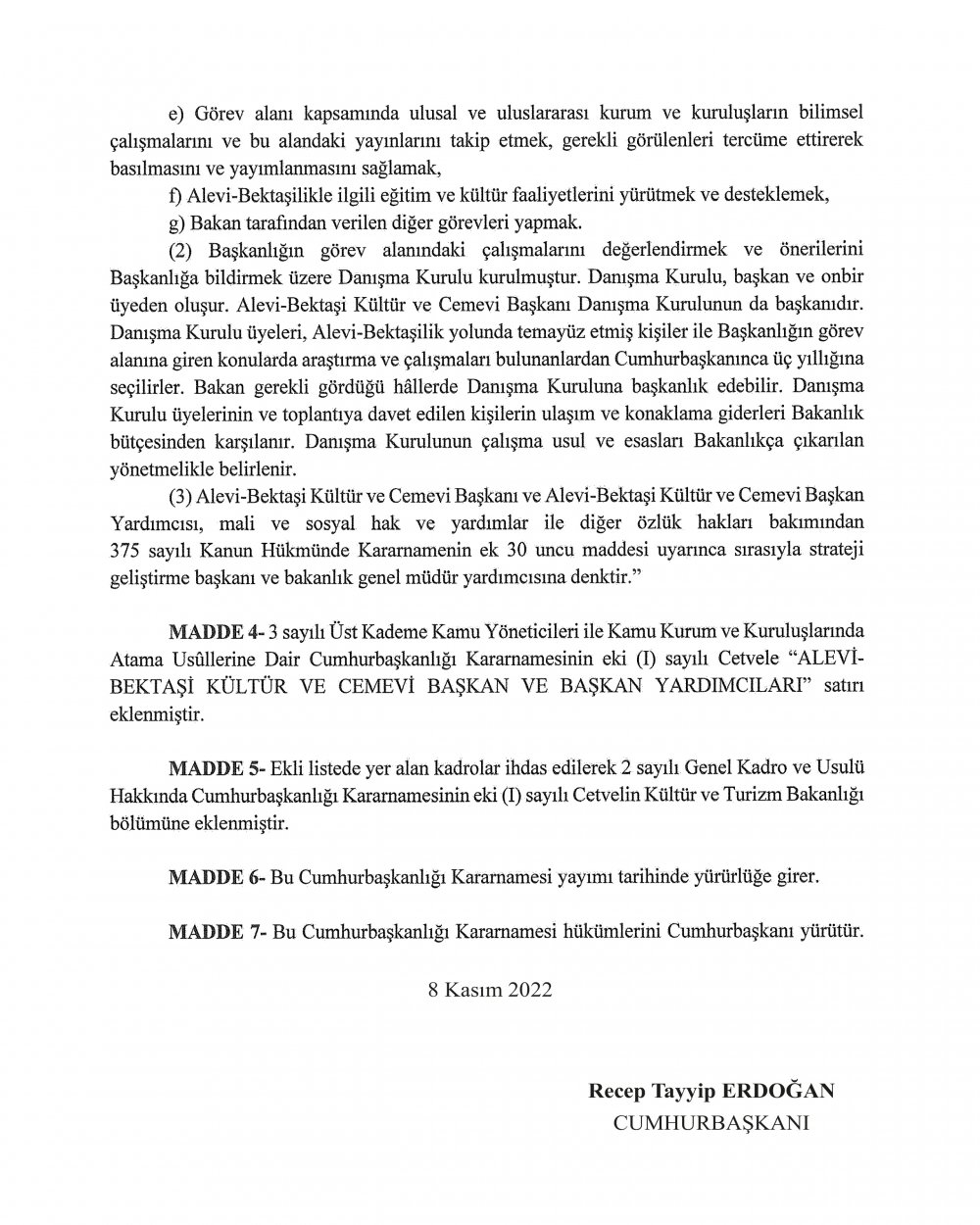Erdoğan, sosyal medya hesabından, "Alevi-Bektaşi vatandaşlarımız ile cemevlerimizin ihtiyaçlarını karşılayacak Alevi-Bektaşi Kültür ve Cemevi Başkanlığımız Resmi Gazete'de yayımlanarak kuruldu. Demokratikleşme reformlarımızdan bir tanesi olan bu adım, ülkemize ve Alevi-Bektaşi kardeşlerimize hayırlı olsun." paylaşımında bulundu.
