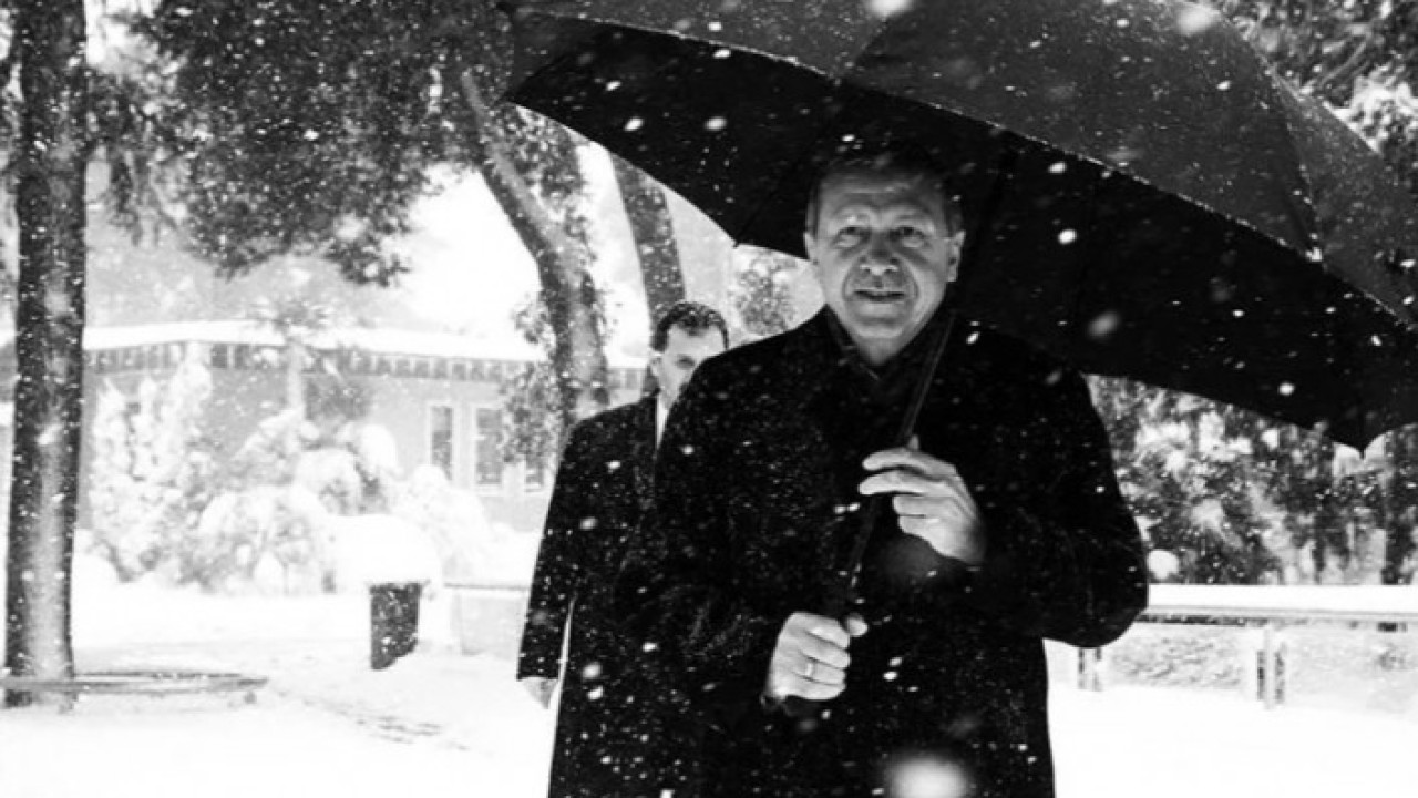 Erdoğan, sosyal medya hesapları Telegram, BİP ve Instagram'dan kar yağışı altında şemsiye ile yürüdüğü bir fotoğrafı siyah beyaz olarak paylaşarak, "Birkaç yıl öncesinden bir kar hatırası" ifadelerini kullandı.