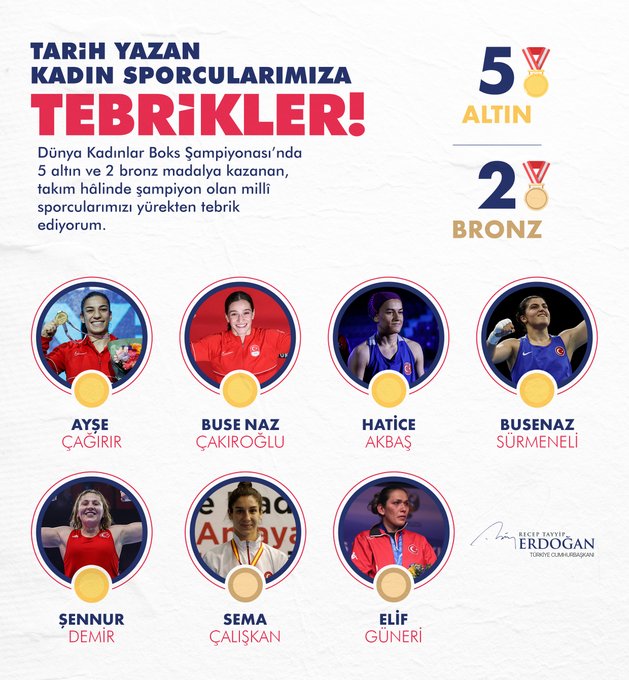 Cumhurbaşkanı Erdoğan, Twitter hesabından yaptığı paylaşımda, "Türkiye'nin ev sahipliğinde düzenlenen Dünya Kadınlar Boks Şampiyonası'nda 5 altın, 2 bronz madalya ile tarih yazan, takım halinde şampiyon olan milli sporcularımızı şahsım ve milletim adına yürekten tebrik ediyorum. Şimdi, inşallah hedef Paris Olimpiyatları." ifadelerini kullandı.