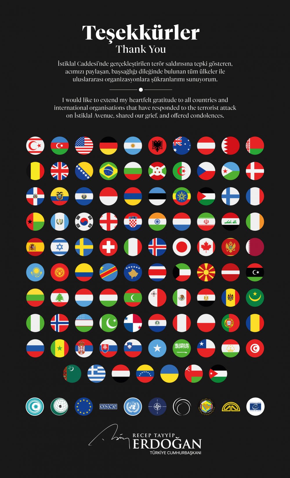 Geçmiş olsun dileklerini ileten ve taziye mesajı gönderen ülkelerin ve uluslararası kuruluşların listesine paylaşımında yer veren Erdoğan, "İstiklal Caddesi'nde gerçekleştirilen terör saldırısına tepki gösteren, acımızı paylaşan, başsağlığı dileğinde bulunan tüm ülkeler ile uluslararası organizasyonlara şükranlarımı sunuyorum." ifadelerini kullandı.