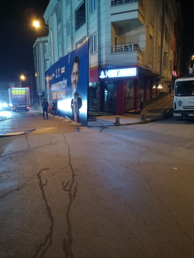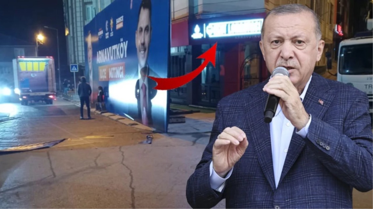 Cumhurbaşkanı Erdoğan'ın Arnavutköy mitingi öncesi İstanbul Büyükşehir Belediyesi'nin 28 Mart'ta açtığı Kent Lokantası'nın önüne AK Parti'nin adayı Murat Kurum'un afişi yerleştirildi.