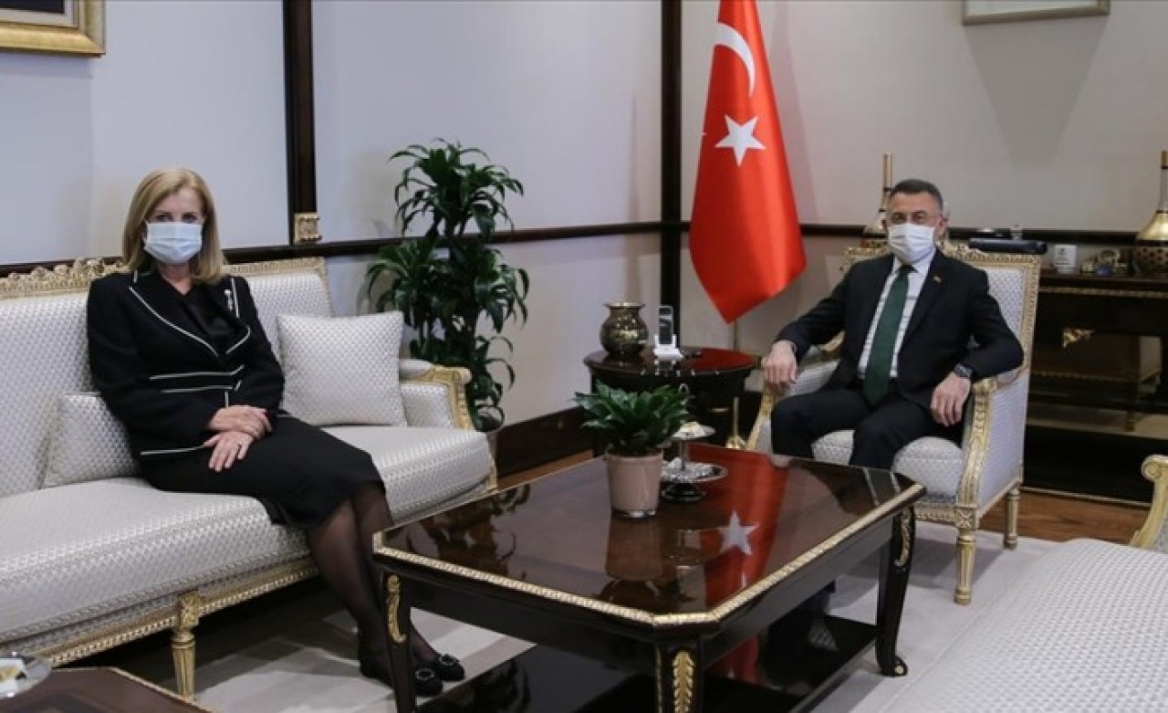 Cumhurbaşkanlığı Külliyesi'ndeki görüşmede Fuat Oktay, KKTC'deki karayolları ve mağduriyet yaşanan köy yollarındaki çalışmalara ilişkin Bakan Resmiye Eroğlu Canaltay'dan bilgi aldı.