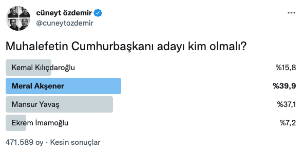 Gazeteci Cüneyt Özdemir Twitter hesabından konuyla ilgili bir anket düzenledi ve "Millet İttifakı’nın Cumhurbaşkanı adayı kim olmalı?" diye sordu.
