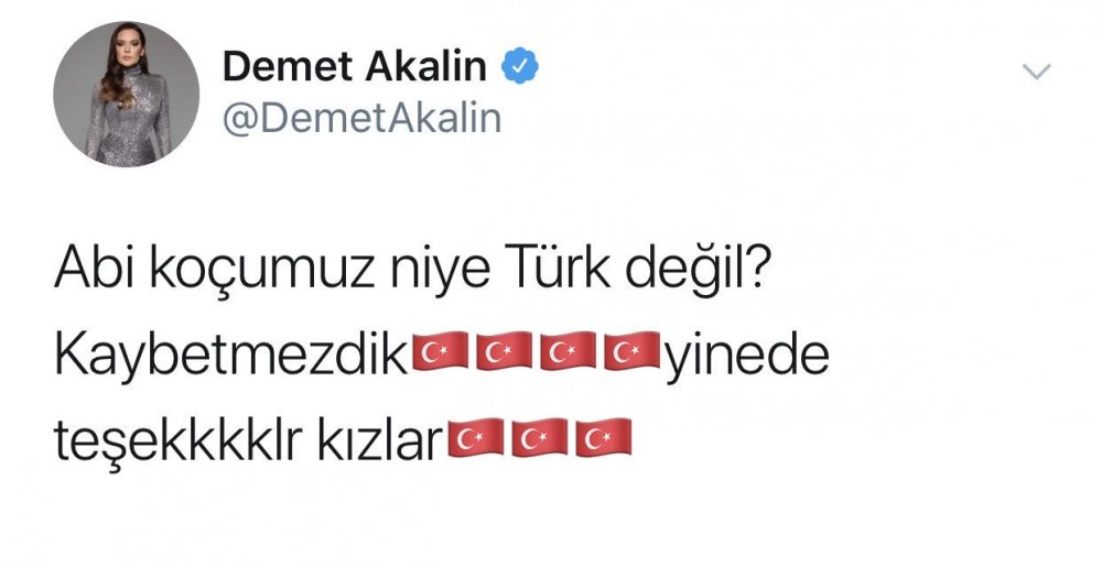 Şarkılarıyla özellikle yaz mevsimine damga vurmayı başaran Demet Akalın bu sefer de Twitter'da yazdıklarıyla gündem oldu. 16 yıl sonra ilk defa Avrupa Voleybol Şampiyonası'nda finale kalmayı başaran ve iyi bir oyun ortaya koyan Filenin Sultanları için Demet Akalın'dan tepki çeken bir yorum geldi. Maçın heyecanı ile sürekli tweetler atan Akalın'ın son yazdıkları yankı uyandırdı. Ünlü şarkıcı "Abi koçumuz niye Türk değil? Kaybetmezdik yinede teşekkkklr kızlar" söylemiyle tepki çekti.