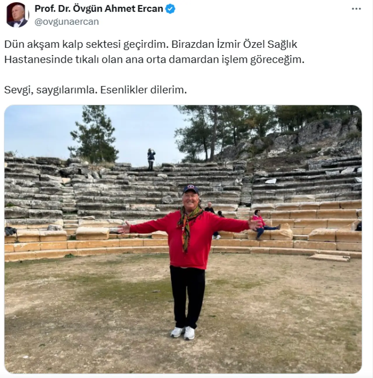 77 yaşındaki Ercan, haberi sosyal medya hesabından yaptığı paylaşımla duyurdu.
