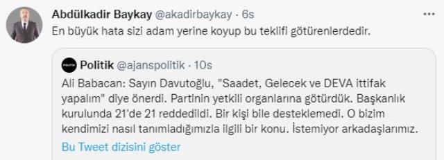 Babacan'ın bu açıklamaları üzerine Gelecek Partisi Kurucular Kurulu Üyesi Abdülkadir Baykay, sosyal medya hesabından ağır ifadeler kullandı. Paylaşımında Baykay, "En büyük hata sizi adam yerine koyup bu teklifi götürenlerdedir" dedi.