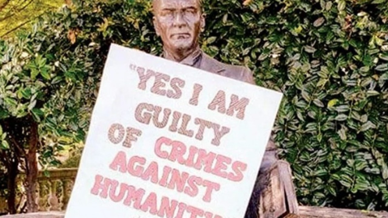 Washington'da perşembe günü Türk büyükelçilik konutu önündeki Atatürk heykeline yönelik saldırıda, heykelin üzerine İngilizce "Evet, insanlığa karşı işlenen suçlardan suçluyum" yazılı pankart asılmıştı.