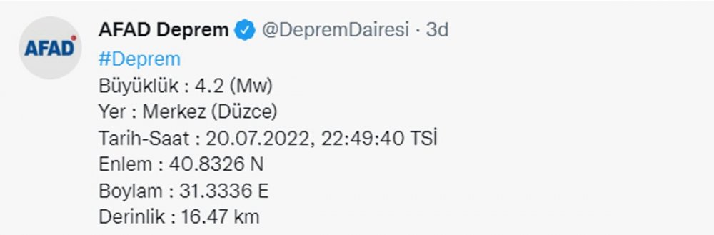 AFAD'ın verilerine göre, Düzce'de 4.2 büyüklüğünde deprem meydana geldi.