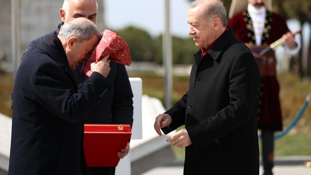 Cumhurbaşkanı Erdoğan, sancağı öpüp alnına koyduktan sonra Milli Savunma Bakanı Hulusi Akar`a teslim etti. Akar, sancağı üç kez öpüp alına koyarak teslim aldı.