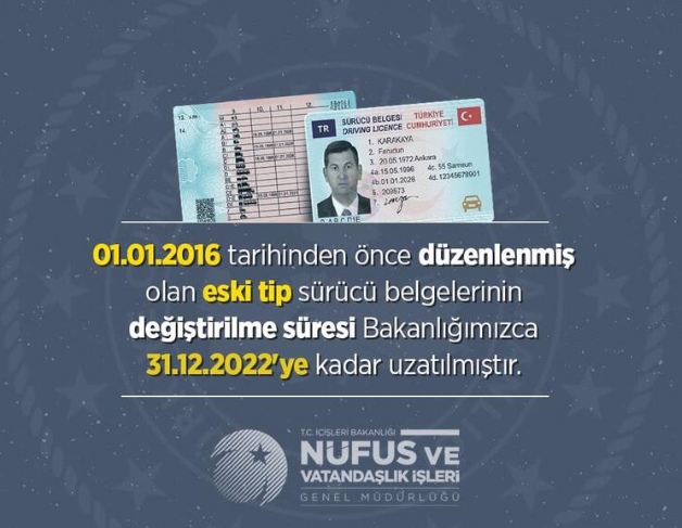 "01.01.2016 tarihinden önce düzenlenmiş olan eski sürücü belgelerinin yeni tip sürücü belgeleri ile değiştirilmesi sürecinde vatandaşlarımızın başvuru yoğunluğundan kaynaklı yaşayabilecekleri mağduriyetlerin önüne geçilmesi amacıyla; Eski sürücü belgelerinin değiştirilme süresi Bakanlığımızca 31.12.2022’ye kadar uzatılmıştır."