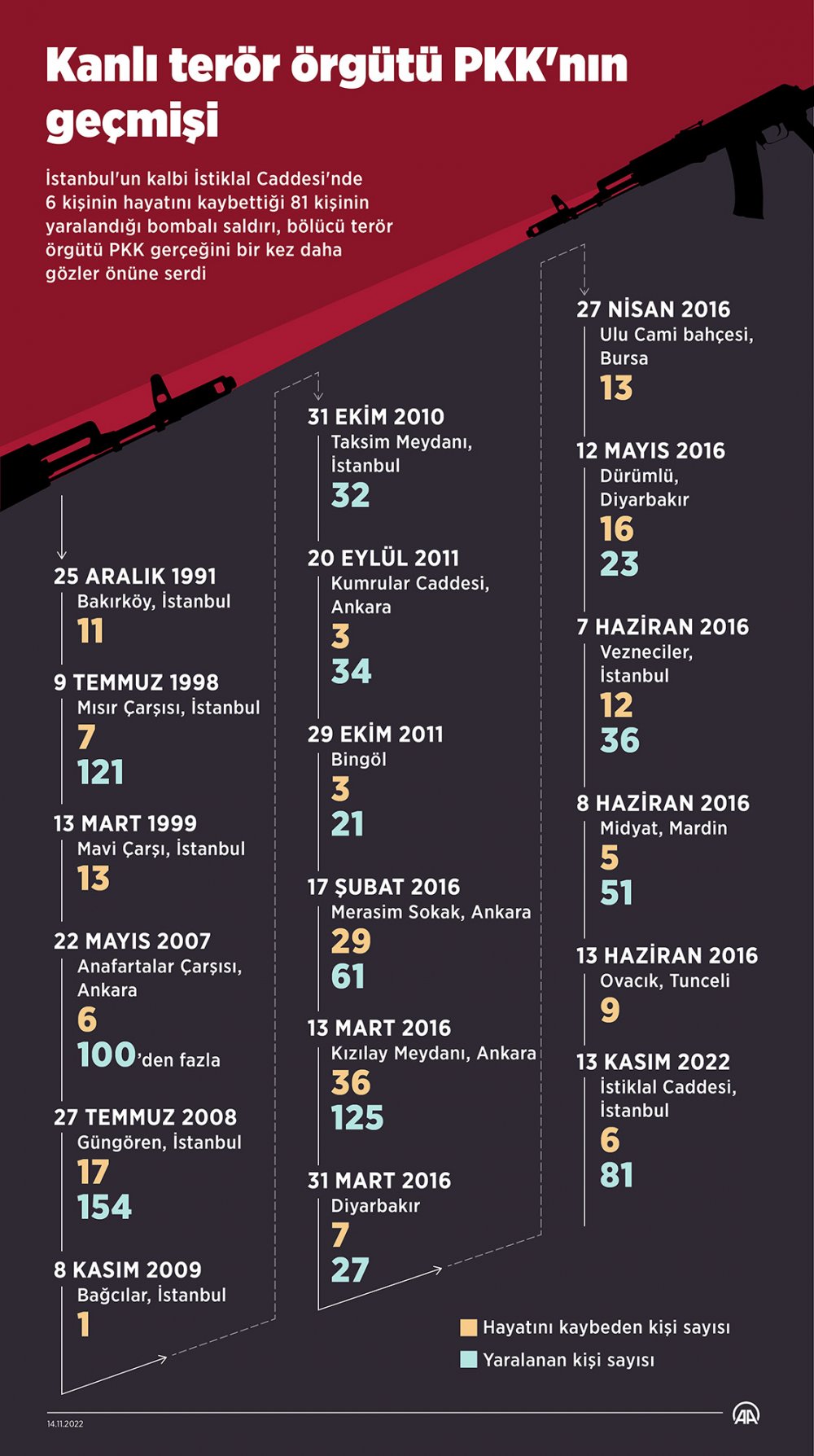 Kendisinden başkasına yaşam hakkı tanımayan bölücü örgüt, 6 kişinin hayatını kaybettiği 81 kişinin de yaralandığı Beyoğlu İstiklal Caddesi'ndeki saldırıda, kanlı yüzünü bir kez daha gösterdi.
