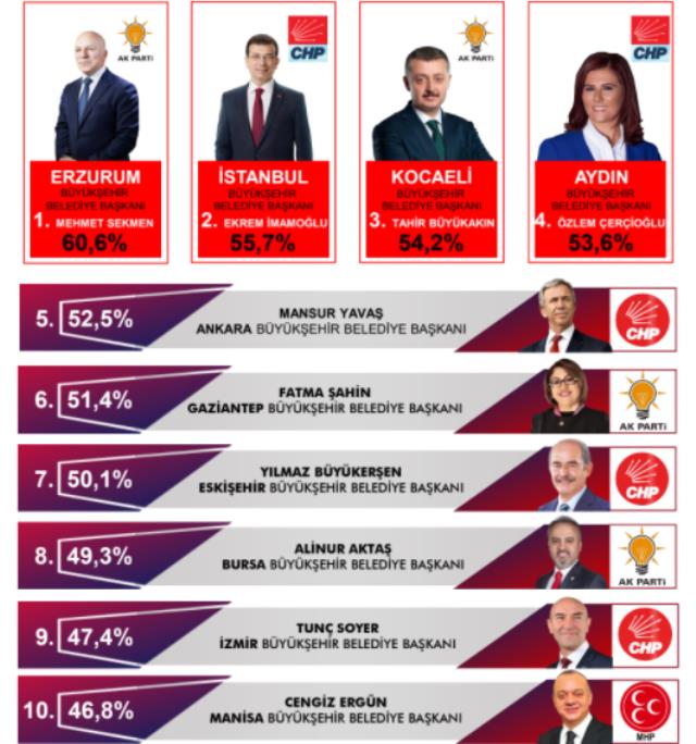 Listenin üçüncü sırasında %54.2 ile Kocaeli Büyükşehir Belediye Başkanı Tahir Büyükakın, dördüncü sırada %53.6 ile Aydın Büyükşehir Belediye Başkanı Özlem Çerçioğlu bulunuyor. Ankara Büyükşehir Belediye Başkanı Mansur Yavaş ise listenin beşinci sırasında yer bulabildi.