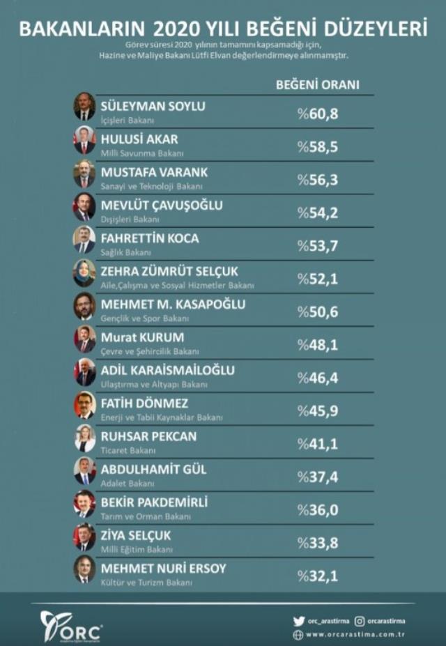 2021 yılına sayılı günler kala ORC Araştırma şirketi, 2020 yılının kabinesindeki bakanların performansını değerlendiren bir anket düzenledi. Vatandaşlara "En çok hangi bakanı beğeniyorsunuz?" sorusu yöneltildi. Anket kapsamında, görev süresi 2020 yılının tamamını kapsamadığı için Hazine ve Maliye Bakanı Lütfi Elvan değerlendirmeye alınmadı.