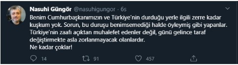 “Benim Cumhurbaşkanımızın ve Türkiye’nin durduğu yerle ilgili zerre kadar kuşkum yok. Sorun, bu duruşu benimsemediği halde öyleymiş gibi yapanlar. Türkiye’nin zaafı açıktan muhalefet edenler değil, günü gelince taraf değiştirmekte asla zorlanmayacak olanlardır. Ne kadar çoklar!”