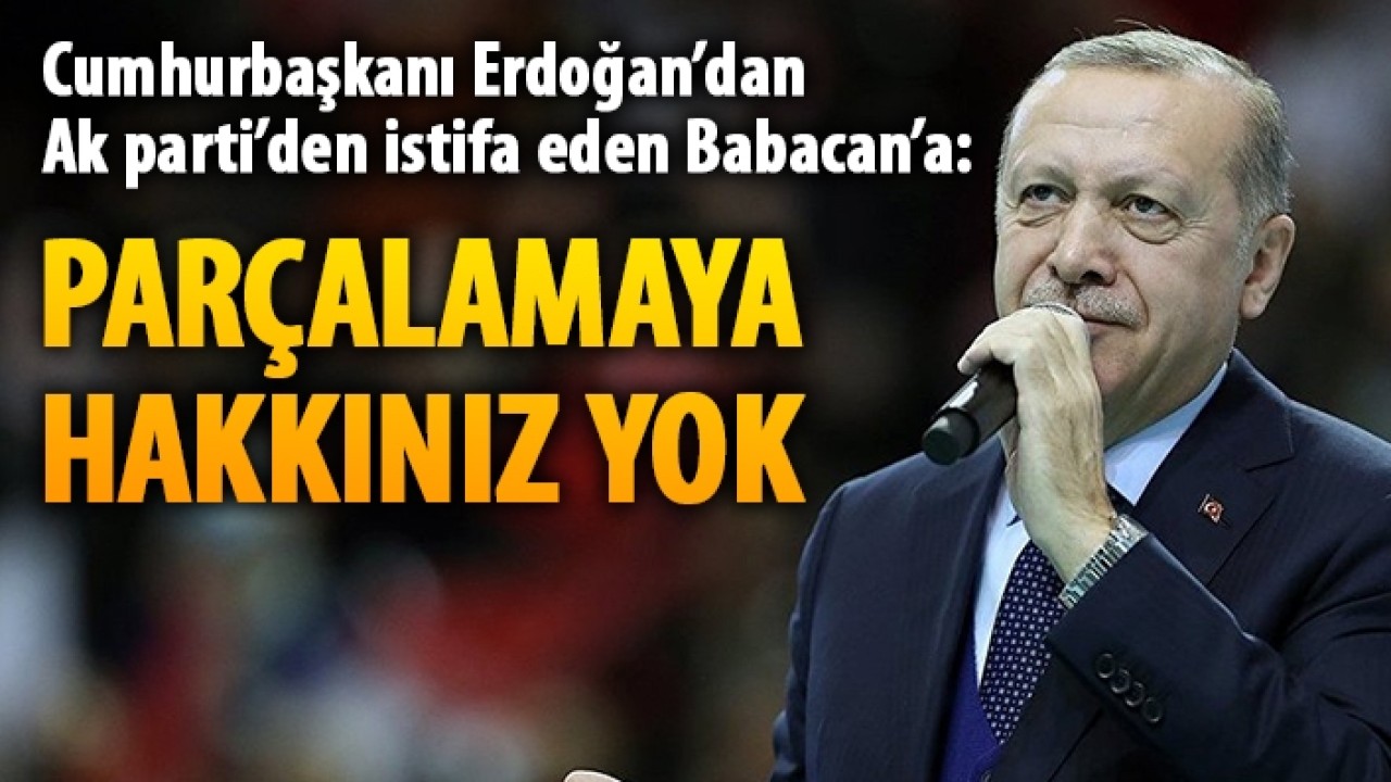 Erdoğan yeni parti çalışmaları yürüten Ali Babacan, Abdullah Gül ve Ahmet Davutoğlu'yla ilgili "Bu ümmeti parçalamaya hakkınız yok" dedi, AK Parti'den istifa eden Babacan ile istifa öncesi yaptığı görüşmenin detaylarından bahsetti: