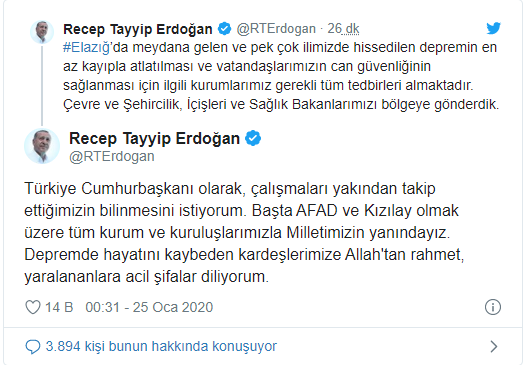 Türkiye Cumhurbaşkanı Erdoğan, "Elazığ’da meydana gelen ve pek çok ilimizde hissedilen depremin en az kayıpla atlatılması ve vatandaşlarımızın can güvenliğinin sağlanması için ilgili kurumlarımız gerekli tüm tedbirleri almaktadır. Çevre ve Şehircilik, İçişleri ve Sağlık Bakanlarımızı bölgeye gönderdik" dedi.,