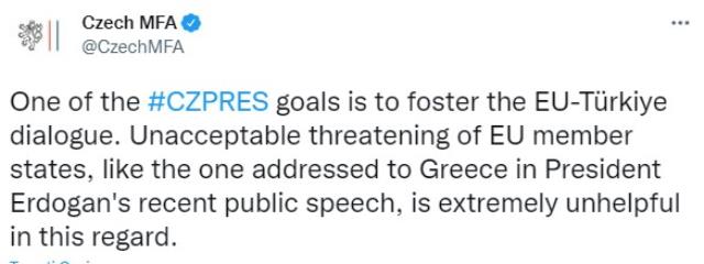 Gündem yaratan polemiğe Avrupa Birliği (AB) dönem başkanlığını yürüten Çek Cumhuriyeti de dahil oldu. Cumhurbaşkanı Erdoğan'ın Yunanistan'a yönelik son sözlerini "kabul edilemez" olarak değerlendiren Çek Cumhuriyeti Dışişleri Bakanlığı'nın Twitter hesabından yapılan paylaşımda, "Hedeflerimizden biri de AB-Türkiye diyaloğunu teşvik etmektir. Cumhurbaşkanı Erdoğan'ın Yunanistan'a hitaben yaptığı son açıklama gibi, AB'ye üye devletlerinin kabul edilemez şekilde tehdit edilmesi, bu konuda (diyaloğun teşvikini kastediyor) son derece yararsızdır" denildi.