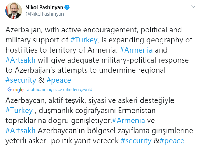 Paşinyan, Twitter hesabından yaptığı paylaşımda, "Azerbaycan, Türkiye'nin politik ve askeri desteğiyle Ermenistan topraklarına karşı coğrafik düşmanlığını genişletiyor. Ermenistan, Azerbaycan'ın bölgesel güvenlik ve barışı baltalayan tüm teşebbüslerine gerekli askeri ve politik cevabı verecektir" ifadelerini kullandı.