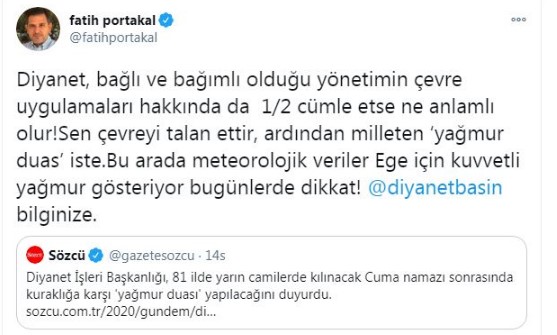 FOX TV’nin eski ana haber sunusu Fatih Portakal Diyanet İşleri Başkanlığı’nın bugün Cuma namazı sonrası kuraklığa karşı yağmur duası yapılacağını açıklaması sonrası dikkat çeken bir paylaşım yaptı.