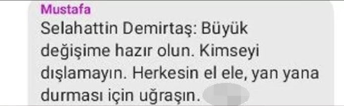 Mesajda Demirtaş'ın, "Büyük değişime hazır olun. Kimseyi dışlamayın. Herkesin el ele, yan yana durması için uğraşın" sözleri yer alıyor.