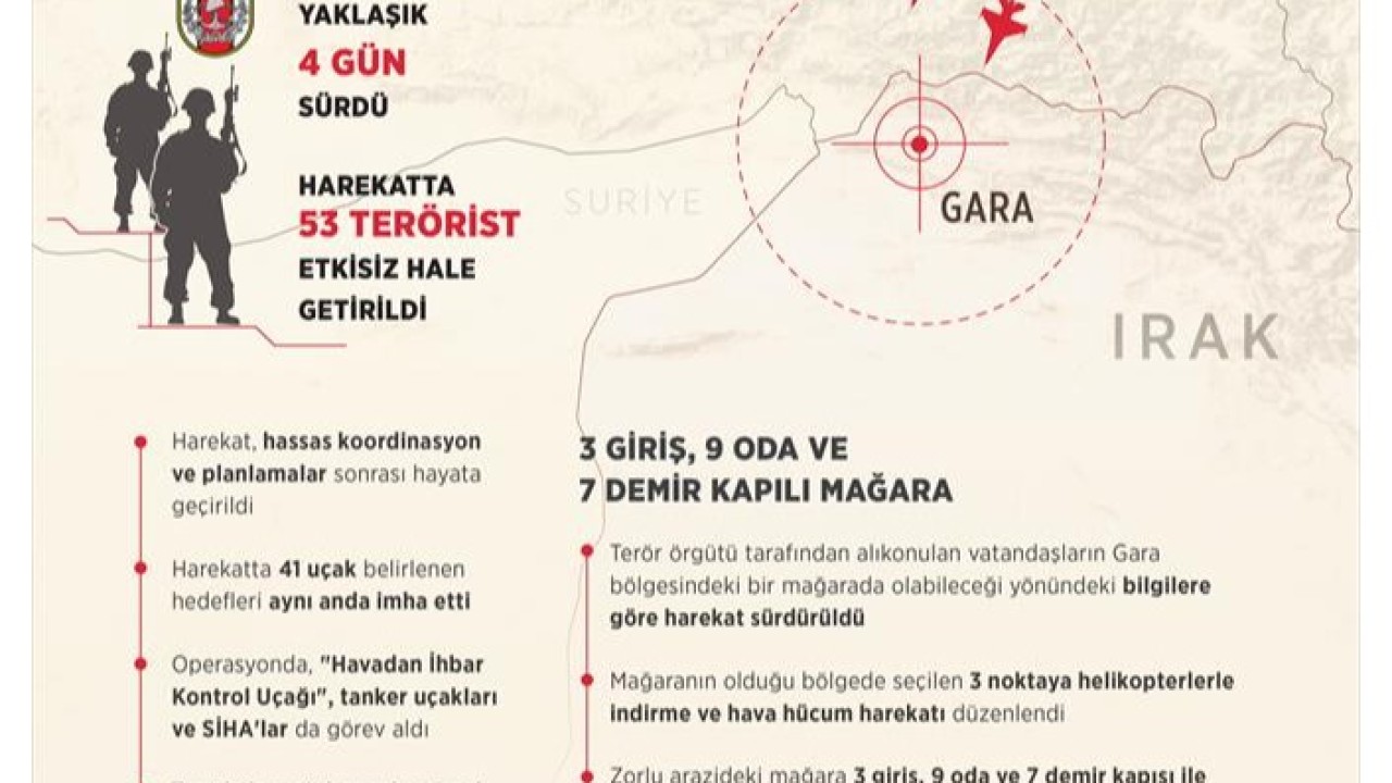 Türk Silahlı Kuvvetleri (TSK), PKK/KCK ve diğer terörist unsurları etkisiz hale getirerek Irak'ın kuzeyinden halka ve güvenlik güçlerine yönelen terör saldırılarını bertaraf etmek için teröristler tarafından Gara bölgesinde kullanılan hedeflere yönelik 10 Şubat saat 02.55’te başlattığı "Pençe Kartal-2 Harekatı"nı tamamladı.