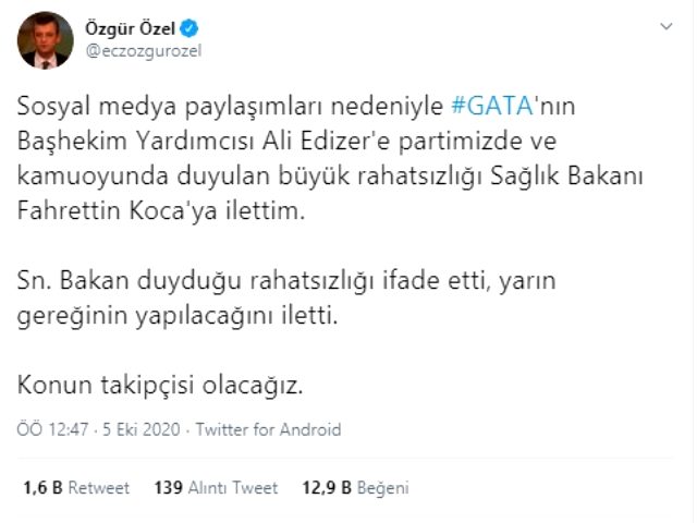 İnfial yaratan bu paylaşım CHP'nin de gündeminde yer aldı. Konuyla ilgili olarak sosyal medya hesabında paylaşımda bulunan CHP Manisa Milletvekili ve Grup Başkanvekili Özgür Özel, Edizer'in açıklamalarını Sağlık Bakanı Fahrettin Koca'ya ilettiğini duyurdu.