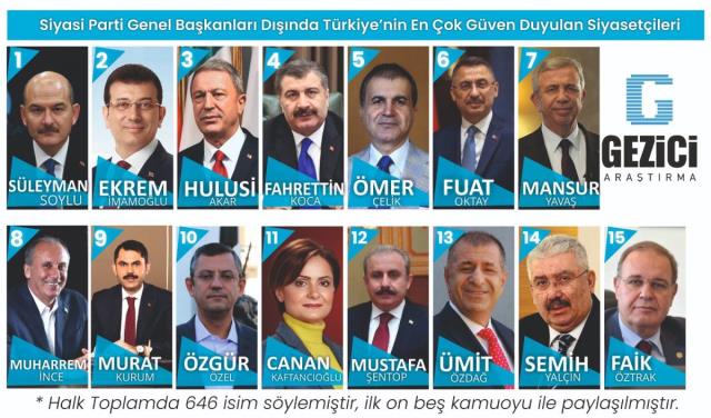 Siyasi parti genel başkanlarının yer verilmediği ankette, halkın en çok güven duyduğu isim İçişleri Bakanı Süleyman Soylu oldu. İstanbul Büyükşehir Belediye Başkanı Ekrem İmamoğlu listede ikinci sırada yer aldı.