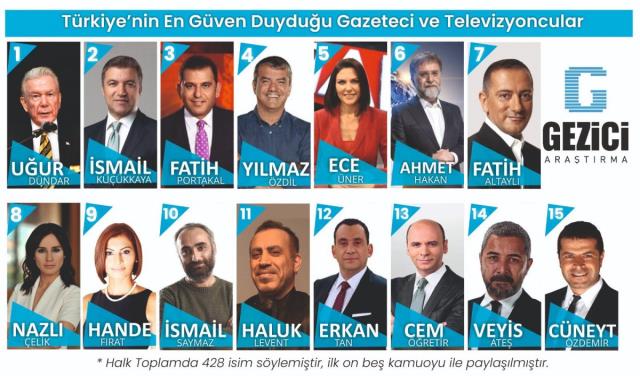 428 ismin söylendiği Türkiye'nin en güvenilir medya isimleri sıralamasında ise zirveyi Uğur Dündar aldı.