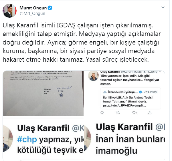 Söz konusu iddialara yanıt veren İstanbul Büyükşehir Belediyesi Sözcüsü Murat Ongun, "Ulaş Karanfil isimli İGDAŞ çalışanı işten çıkarılmamış, emekliliğini talep etmiştir. Medyaya yaptığı açıklamalar doğru değildir. Ayrıca; görme engeli, bir kişiye çalıştığı kuruma, başkanına, bir siyasi partiye sosyal medyada hakaret etme hakkı tanımaz. Yasal süreç işletilecek" dedi.