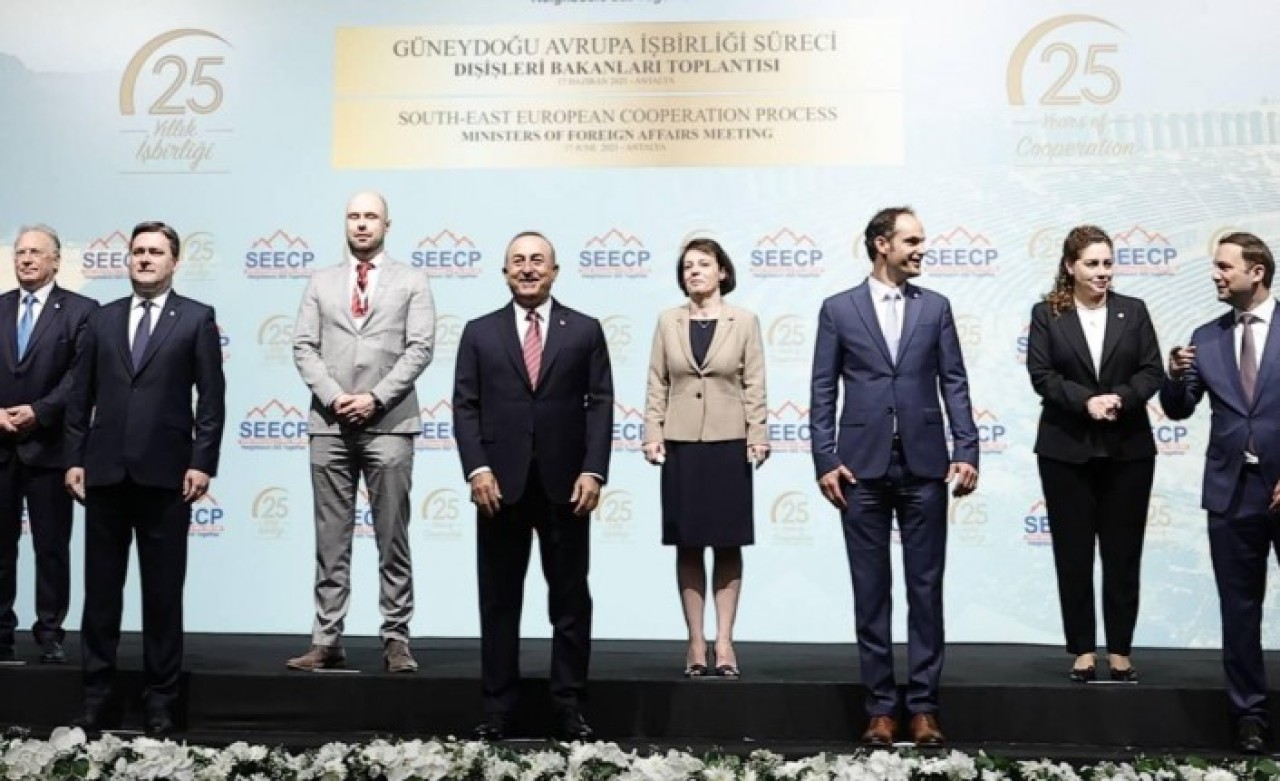 Çavuşoğlu tarafından karşılanan konuk bakanlar, aile fotoğrafının ardından toplantıya geçti.