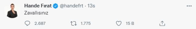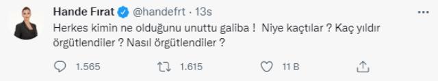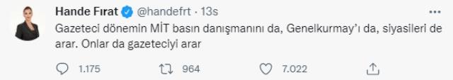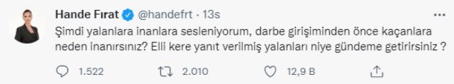 Fırat'ın 15 Temmuz'dan bir gün önce MİT'le görüştüğüne yönelik iddia çok sayıda kişinin hesaplarından paylaşılırken, gündemdeki gazeteci bu habere resmi Twitter hesabından yaptığı oldukça sert açıklamayla yanıt verdi. Hande Fırat, sosyal medya hesabından şu açıklamaları yaptı;