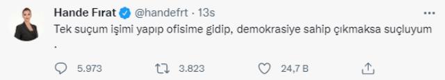 Tek suçum işimi yapıp ofisime gidip, demokrasiye sahip çıkmaksa suçluyum. Benim siz Fetöcülerle ya da başınızdaki ile tek karemi bulamazsanız. Yettiniz artık! Yalanlarınızı ve pis ellerinizi bu ülkenin üzerinden çekin. Zavallısınız."