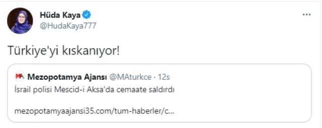 Sosyal medyanın gündemine oturan kanlı saldırıyla ilgili HDP İstanbul Milletvekili Hüda Kaya'dan skandal bir paylaşım geldi. Sosyal medyadanMescid'i Aksa'da cemaate saldırı haberini "Türkiye'yi kıskanıyor" notuyla paylaşan Kaya, Türkiye'deki camilere saldırılar düzenlendiği yönünde algı oluşturmaya çalıştı.