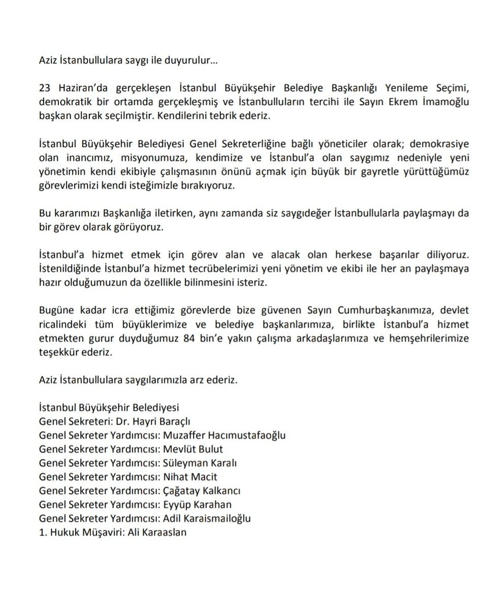 İstifa haberini İBB Genel Sekreteri Hayri Baraçlı sosyal medya hesabından paylaştı.