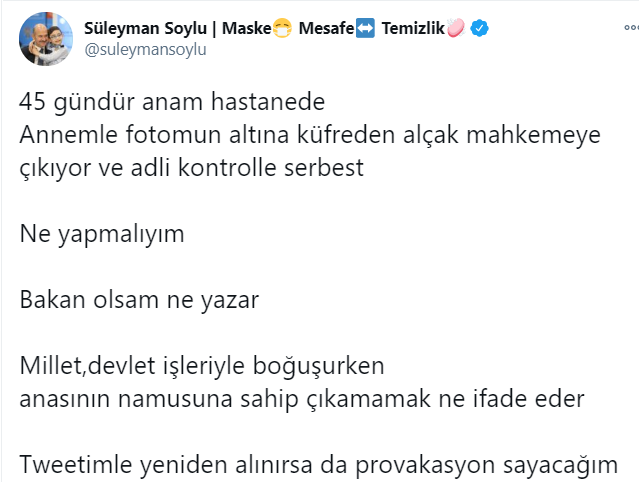 Soylu, "45 gündür anam hastanede Annemle fotomun altına küfreden alçak mahkemeye çıkıyor ve adli kontrolle serbest Ne yapmalıyım Bakan olsam ne yazar Millet, devlet işleriyle boğuşurken anasının namusuna sahip çıkamamak ne ifade eder. Tweetimle yeniden alınırsa da provakasyon sayacağım" paylaşımında bulundu.