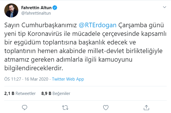 Altun, "Sayın Cumhurbaşkanımız Recep Tayyip Erdoğan çarşamba günü yeni tip koronavirüs ile mücadele çerçevesinde kapsamlı bir eşgüdüm toplantısına başkanlık edecek ve toplantının hemen akabinde millet-devlet birlikteliğiyle atmamız gereken adımlarla ilgili kamuoyunu bilgilendirecektir" açıklamasında bulundu.