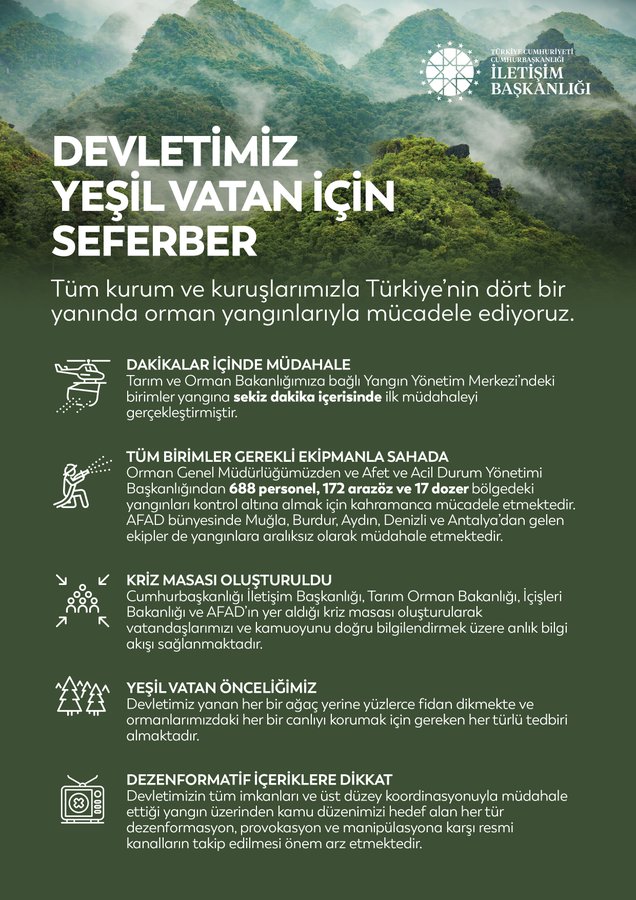İletişim Başkanlığı, Tarım Orman Bakanlığı, İçişleri Bakanlığı ve AFAD'ın yer aldığı kriz masası oluşturularak, vatandaşların ve kamuoyunun doğru bilgilendirmesi için anlık bilgi akışı sağlandığı vurgulanan açıklamada, "Devletimiz yanan her bir ağaç yerine yüzlerce fidan dikmekte ve ormanlarımızdaki her bir canlıyı korumak için gereken her türlü tedbiri almaktadır" denildi.