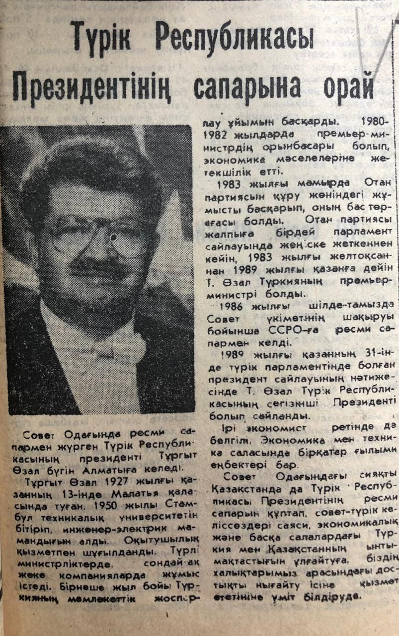 Türkiye'nin 8. Cumhurbaşkanı Turgut Özal, 30 yıl önce bugün başlayan iki günlük resmi ziyareti ile, bağımsız Kazakistan'a en üst düzeyde giden ilk yabancı lider olarak kayıtlara geçti.