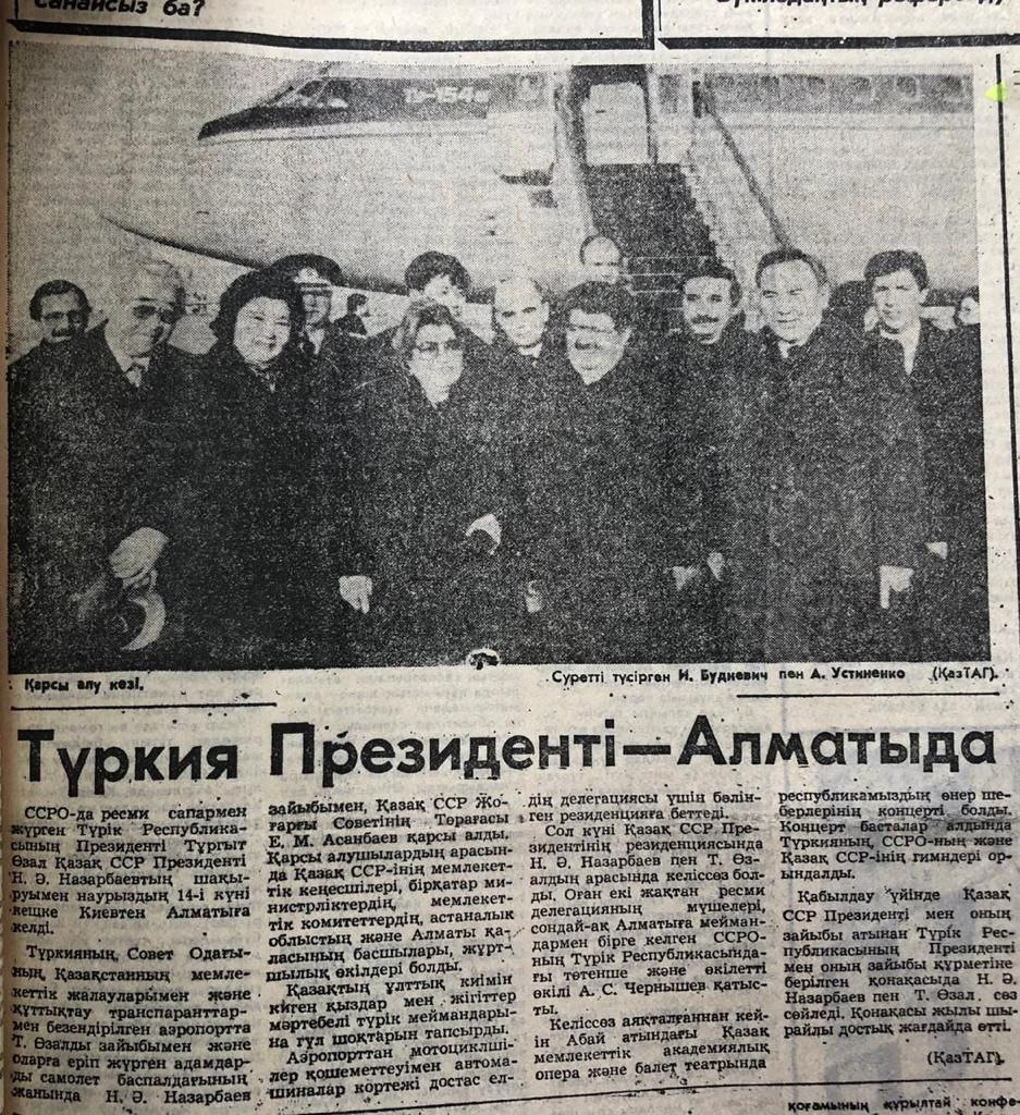Özal ve dönemin Dışişleri Bakanı Ahmet Kurtcebe Alptemoçin, Kültür Bakanı Namık Kemal Zeybek, Türkiye'nin Sovyetler Birliği Büyükelçisi Volkan Vural'dan oluşan resmi heyet, Kazakistan'ın ilk Cumhurbaşkanı Nursultan Nazarbayev'in daveti üzerine ülkenin o zamanki başkenti Almatı'ya geldi.