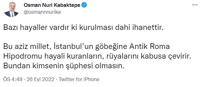 İBB, Sultanahmet Meydanı ve bölgede bulunan diğer Osmanlı mirası eserleri hiçe sayarak Bizans'ın bile o dönem terk ettiği ve yıkılmaya bıraktığı Antik Roma Hipodromu'nun restore etmeye çalışmasına sosyal medyadan büyük tepki gelirken AK Parti İstanbul İl Başkanı Osman Nuri Kabaktepe de tepki gösterdi.