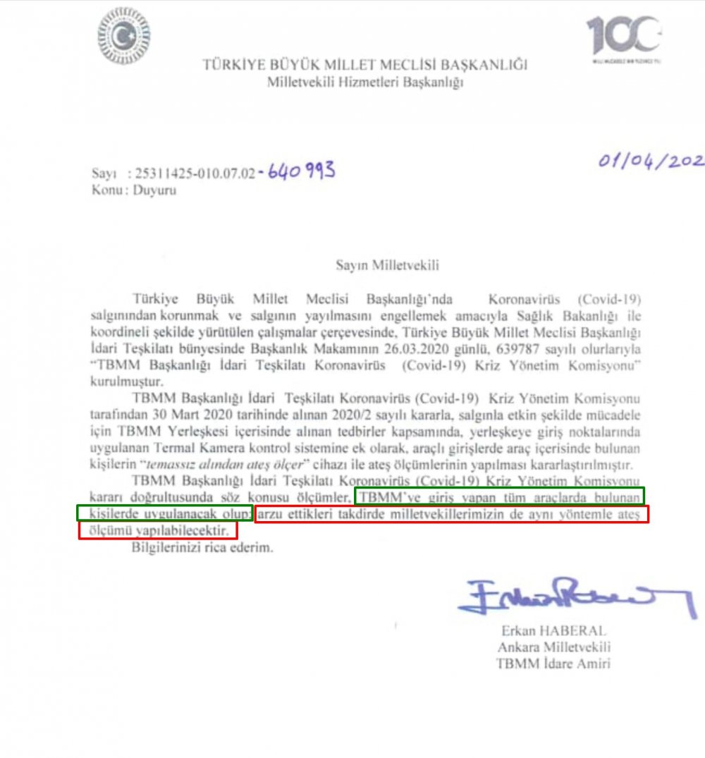 TBMM İdare Amiri Erkan Haberal imzasıyla milletvekillerine gönderilen yazıda "TBMM’ye giriş yapan araçlardaki herkesin ateşinin kontrol edileceği vurgulanırken, “Arzu ettikleri takdirde milletvekillerimizin de aynı yöntemle ateş ölçümü yapılabilecektir” denildi.