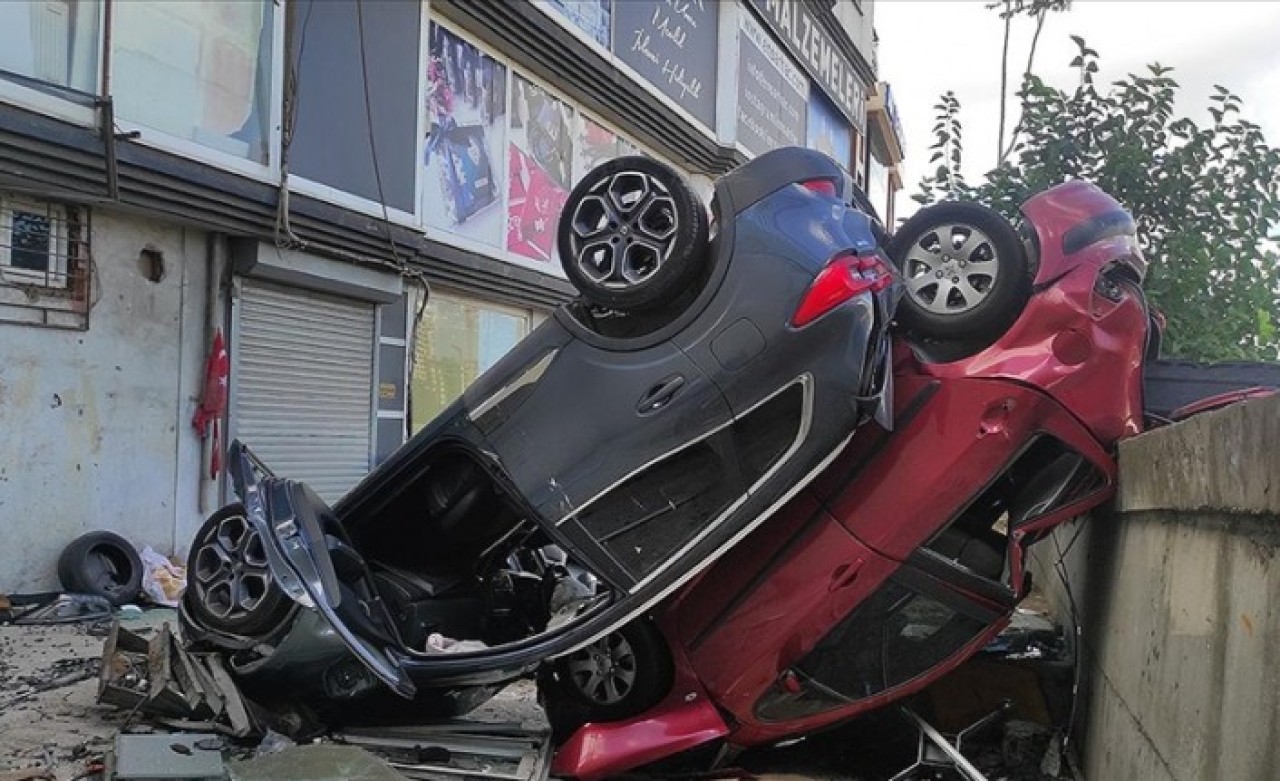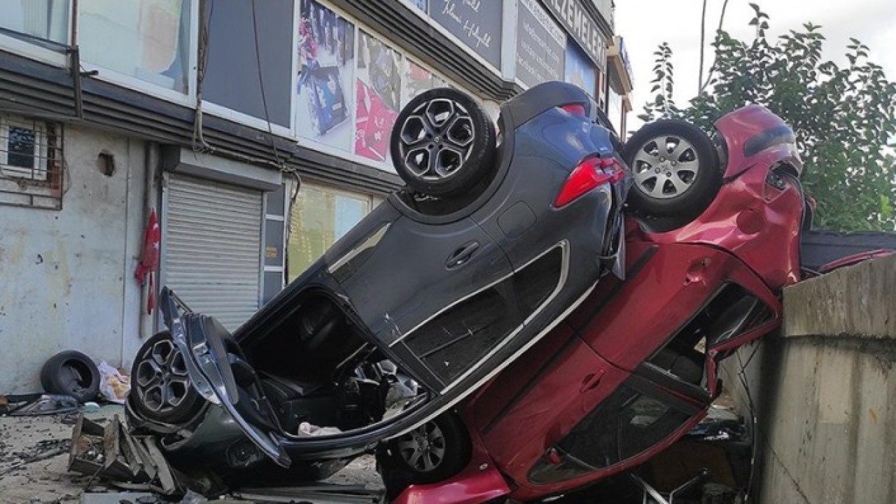 Ardından önündeki aracı sürükleyerek ilerlemeye devam eden araç, iş yerinin ikinci katında bulunan arka cephedeki camı kırarak önündeki otomobille zemine düştü.